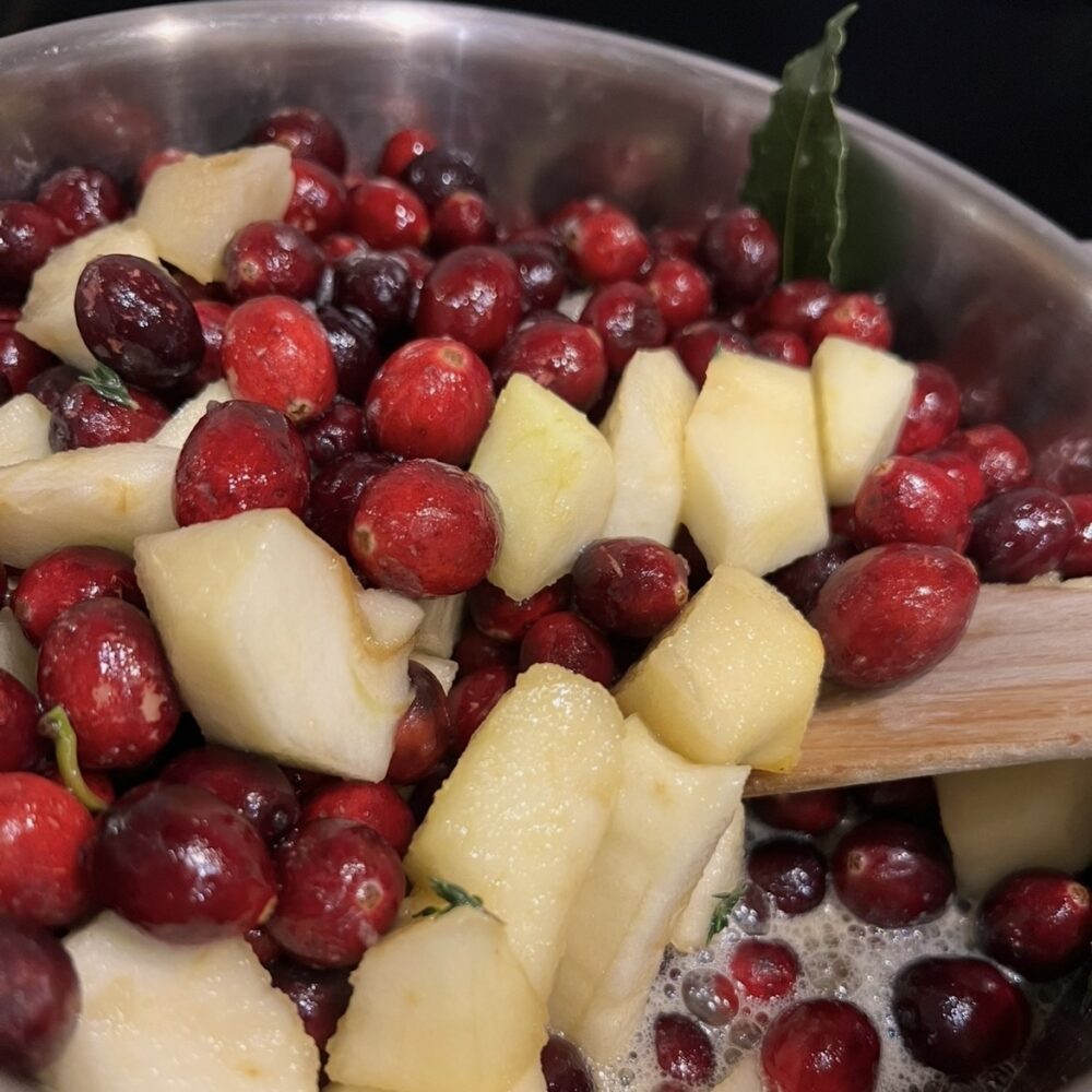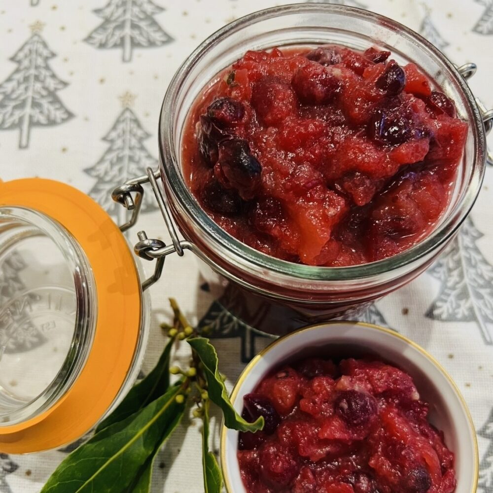 A delicious sauce full of cranberries and apples with a touch of sweetness from the maple syrup. A perfect accompaniment to any festive roast or celebration meal. Leaning towards being slightly tart which I feel really helps to cut through the richness of the meat you’re serving it with, but do add a touch more maple syrup, if you want to.
