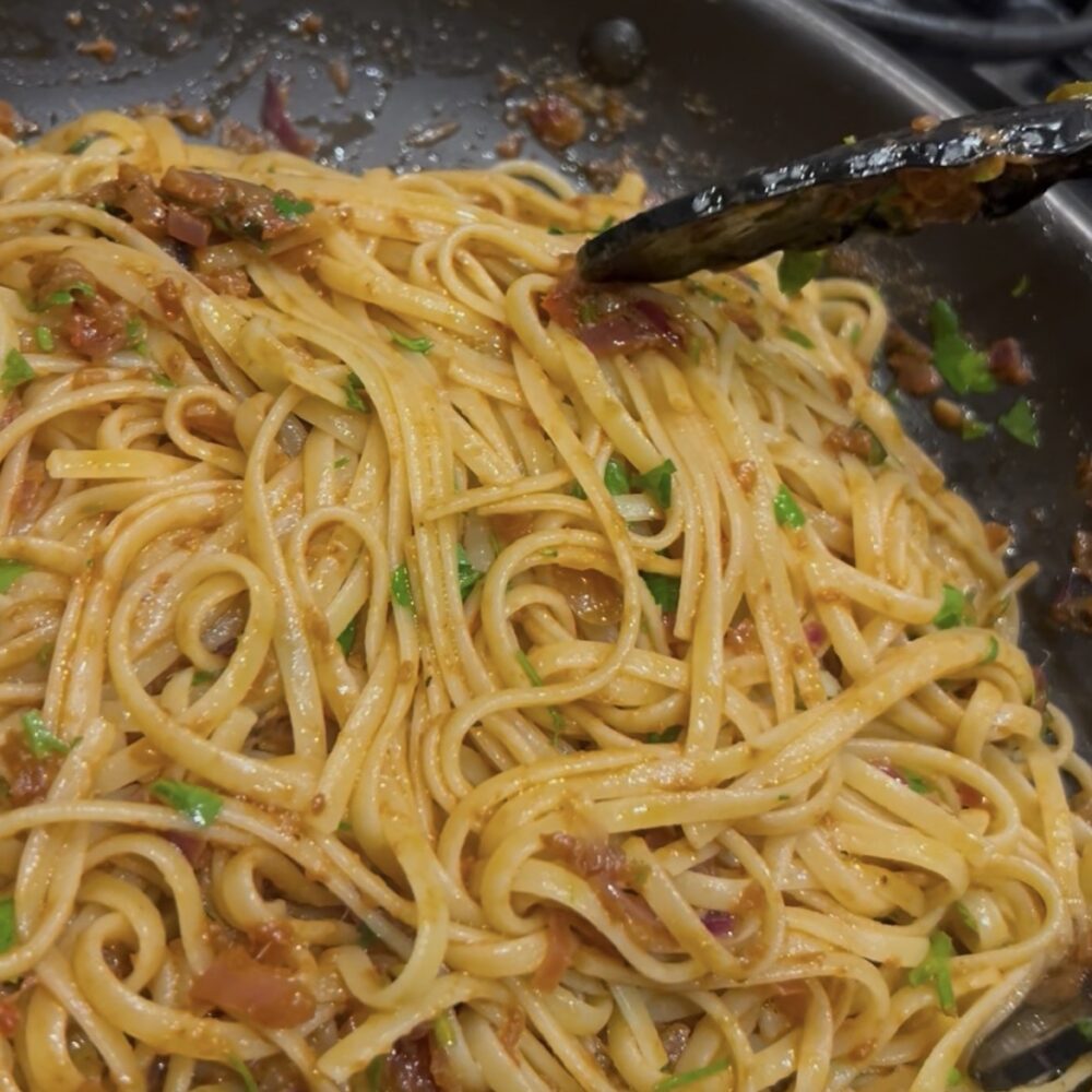03 Add cooked pasta to the anchovy sauce, toss well, check seasoning and add chopped parsley.