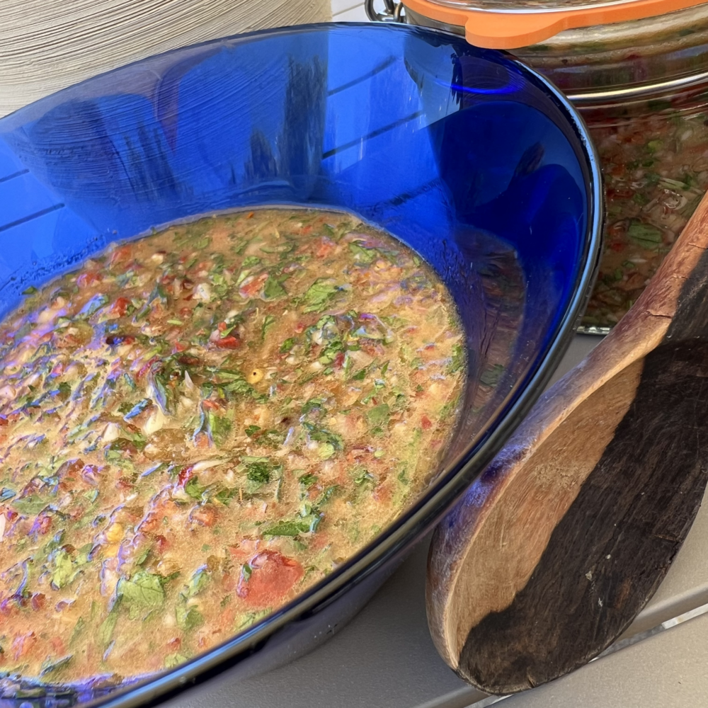 If you are a hot chilli addict as I am, use the hottest red chillies you can muster and be generous with the dried chilli flakes. I like to use a blender or food processor to create this sauce, but for the purist it is acceptable to chop all the ingredients by hand. I often use a mixture of green and red chillies when making this potent sauce. Select the chillies that you like best. All work.