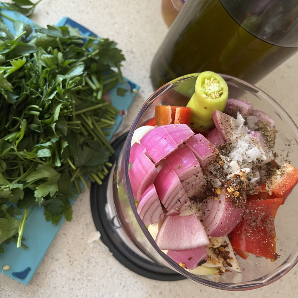 • 02 Place all ingredients into a blender or food processor and pulse to a coarse consistency. Turn into a bowl. Check seasoning and add extra vinegar or extra virgin olive oil and lemon juice as required if sauce is appearing too thick.